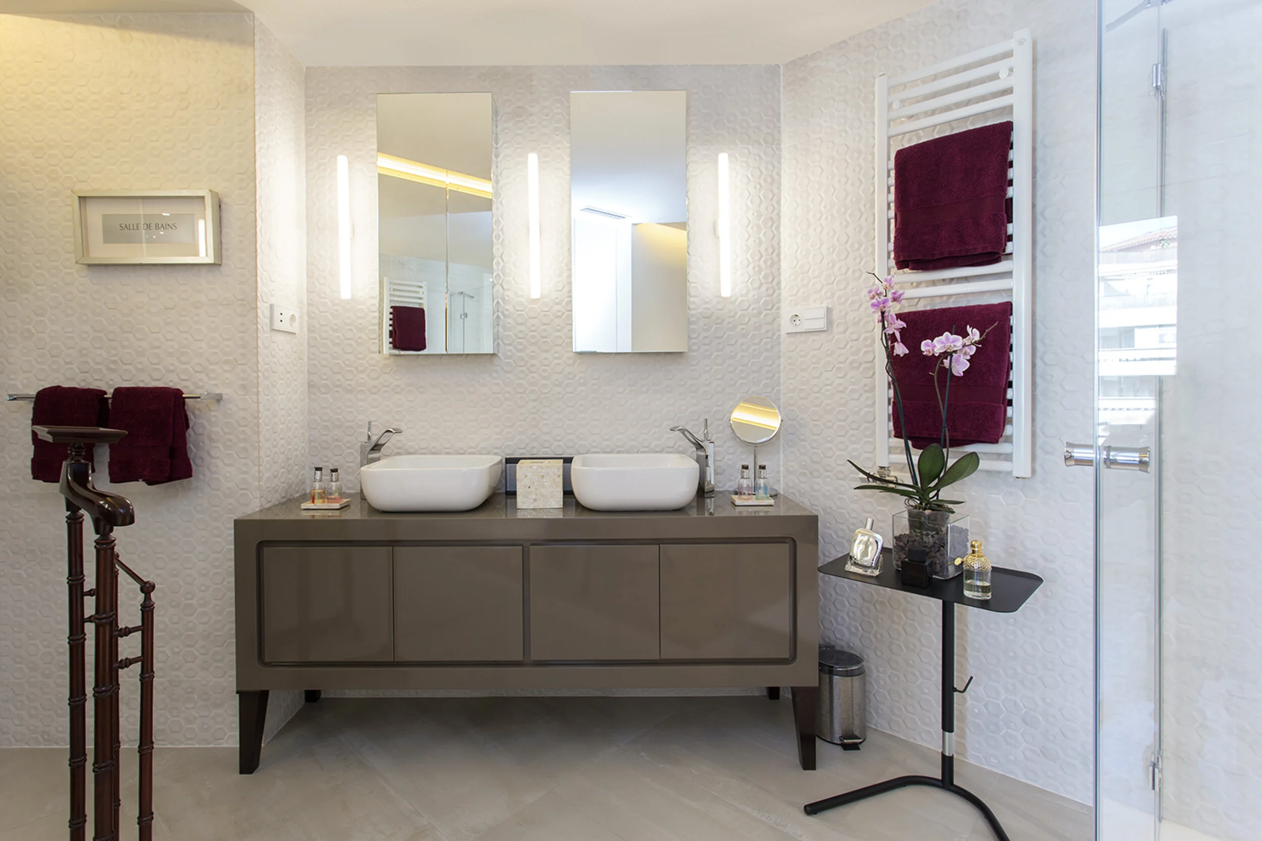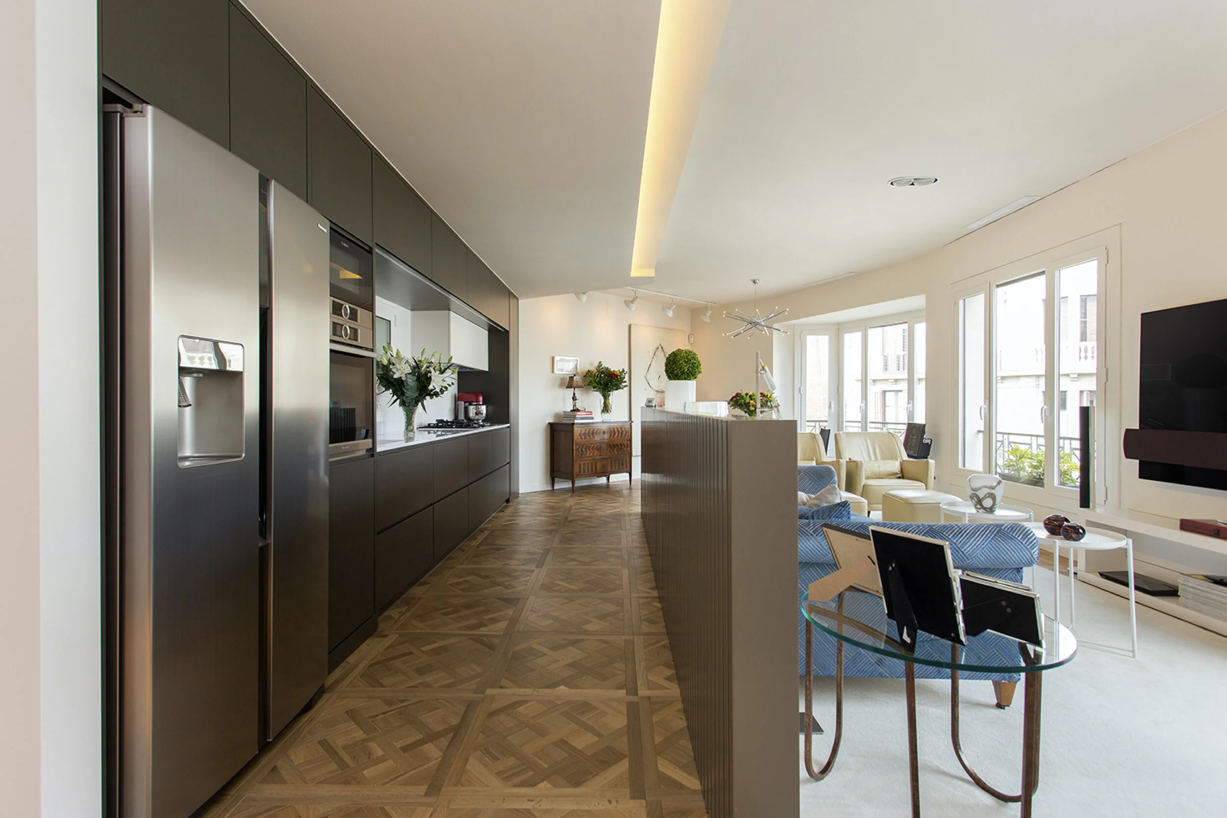 The vision intended to generate a sophisticated and contemporary space but remaining at the same time warm and, somehow, cozy. Rationalism was the basis. A leitmotif was chosen to unite all rooms: a 6-layer grey lacquered ceiling-to-floor strip. Versailles wood flooring brought a distinctive but warm touch. Three double bedrooms, two bathrooms, a kitchen and a big open area were required in a total surface of 116 sqm.